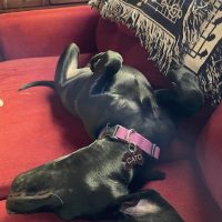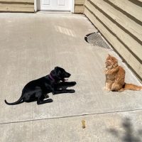 We brought Rookie home on July 12 and renamed him Cato, meaning very wise. He seems to be growing by leaps and bounds and settled in nicely immediately. In addition to the humans, he shares his home with three cats who he keeps trying to play with and he can’t understand why they just want to watch him from a distance! He loves going on walks, playing in the sprinklers, snoozing on the lawn chairs outside and snuggling next to Mama on the couch. He just started training and I’m sure one day, he will be a great hiking and running companion. Many thanks to SHLR for rescuing him and his brothers!