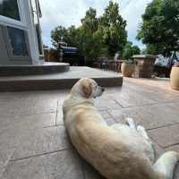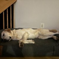 Emma is our second Lab thru SHLR. She was brought to us by her foster parents Andrea and Rich. She’s a complete clumsy fun goofball. Loves everyone, loves Frisbee (and running around with limited vision carrying it), squirrel patrolling her yard. Loves her Orvis “couch”! Quickly becoming our Second Once in a Lifetime dog thru SHLR.