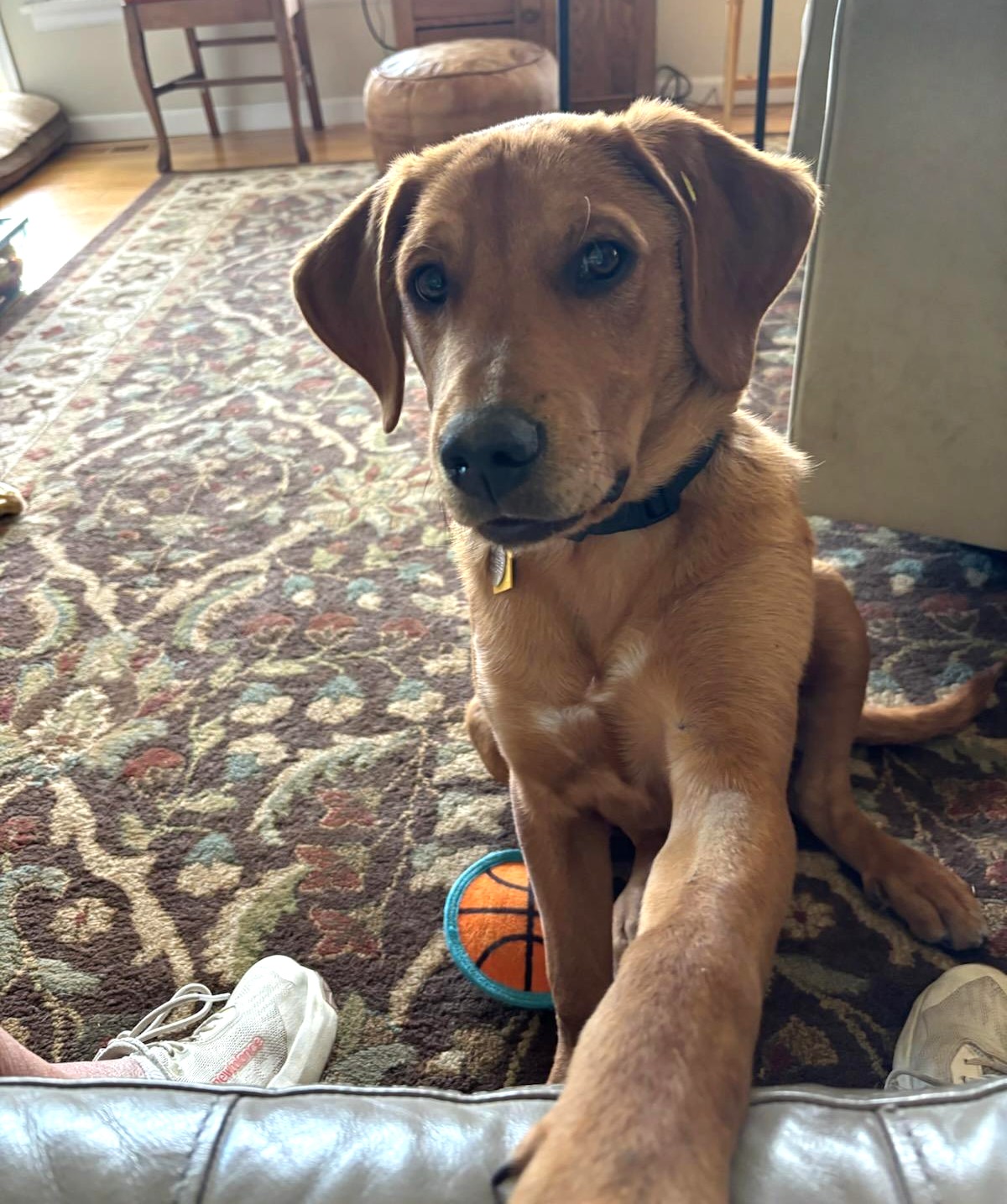 “He’s house trained, crate trained and sleeps quietly in his crate at night. He is a polite greeter, and everyone that meets him can’t believe how calm and gentle he is. Walks well on a leash, and loves to explore and sniff as he goes. Meets other dogs politely and with enthusiasm. He IS in the exploring and chewing stage so a sharp eye and maybe a baby gate here or there would be wise, as would be a supply of approved chewable. Plays with his squeaky toys constantly and fetches a bit, but just beginning.
